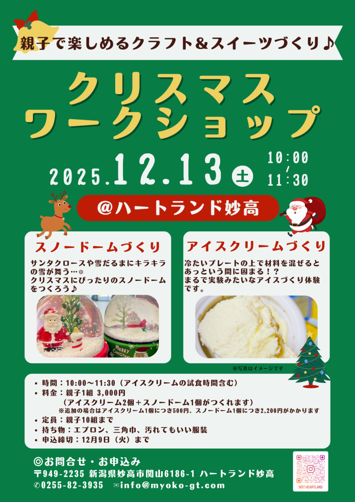ハートランド妙高にて、12月13日(土)にクリスマスワークショップを開催します。親子で楽しいアイスクリームづくり体験とお子様はスノードームづくりが体験できます⭐️ お部屋を彩る可愛いスノードームと美味しいアイスクリームを味わって、クリスマス気分を盛り上げましょう♪
