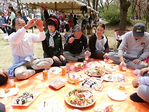 今日は、今年度最初の行事、お花見会を経塚山公園で行いました。幸いにも今日は経塚山さくらまつりの開催日で、快晴の中、大勢の市民で賑わっていました。桜は少しピークを過ぎましたが、屋台村や子供広場での金魚すくい、くじ引きに地元高校生の演奏会など楽しい催しに、参加者の皆さんも大いに楽しんで来ました。