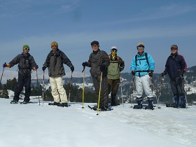 準備体操やスノーシューの装着方法を教えていただき、いざ出発。大滝荘の裏斜面から登ると雪