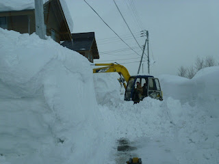 通常はタイヤショベルと呼ばれる小型重機と、この辺でピーターという雪を遠くに飛ばす除雪機の2台で行いますが、とても追いつきません。